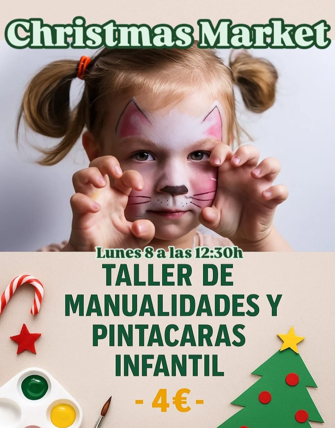 Este lunes 8, a las 12:30 h, los más pequeños podrán sumergirse en la magia de la Navidad en nuestro Christmas Market con un divertido taller de pintacaras. Durante una hora, transformaremos sus caritas en renos, elfos, copos de nieve y muchos personajes festivos más.